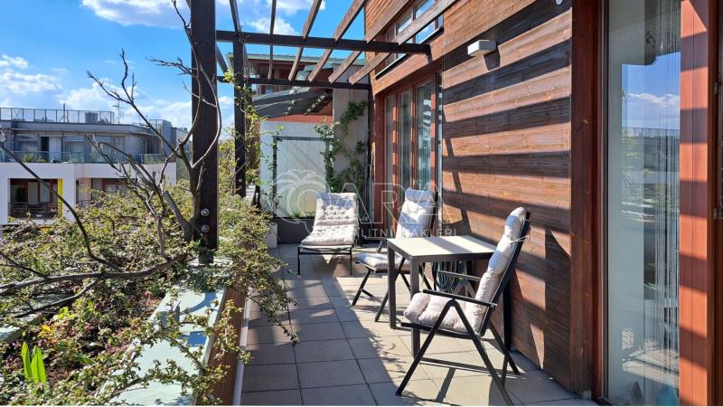 Dominantou je obývací pokoj s plně vybaveným kuchyňským koutem (trouba, myčka, lednice, indukce) a přímým vstupem na téměř 20 m² velikou terasu. Ta nabízí posezení i dostatek soukromí, je ideální pro ranní kávu i večerní pohodu.