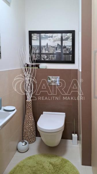 K dispozici je dále samostatná ložnice s vestavěnou skříní. Ložnice je oddělená od obývací části posuvnými dvoukřídlými dveřmi a taktéž má přímý vstup na terasu. V bytě je koupelna s vanou, pračkou a sušičkou a samostatné WC. Byt se pronajímá téměř kompletně zařízený.