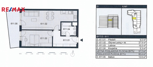 Byt je situován v 6. nadzemním podlaží domu s výtahem a díky své západní orientaci je krásně prosvětlený a zároveň poskytuje dostatek klidu i přes výbornou dostupnost do centra města. Celková podlahová plocha činí 60,4 m² (užitná plocha bytu 57,2 m²) a součástí je prostorný balkon o velikosti 12,8 m².