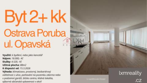 Dovoluji si Vám nabídnout bytovou jednotku 2+kk, s užitnou plochou 88 m2 k pronájmu. Jednotka se nachází v objektu LXM Rezidence na Opavské ulici v Ostravě Porubě. Disponuje oddělenou místností se sprchou a toaletou, předvstupní síní a obytnou místností. Z bytu je zajištěn přístup na terasu, kde si nájemce může umístit své posezení. V okolí bytu se nachází veškerá občanská vybavenost. Svůj vůz zaparkujete v podzemní garáži nebo na venkovním parkovišti. Ráda Vás potkám na prohlídce. Průměrné náklady na služby se ročně pohybují kolem 20 tisíc. Výsledná cena se odvíjí od spotřeby a cen médií. Vstupní platby jsou: Provize: 22.000,- Kč Jistota: 36.000,- Kč Nájem: 18.000,- Kč Služby: 4.520,- Kč Celkem: 80 520,- Kč Dále pokračujete v 2 měsíci nájmu částkou 22.520,- Kč (plus elektřina, TV+internet)