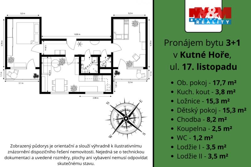 Nabízíme k dlouhodobému pronájmu prostorný byt o dispozici 3+1 a celkové výměře včetně lodžií 71 m², který se nachází v klidné a vyhledávané části Šipší v Kutné Hoře. Byt je situován v 5. nadzemním podlaží panelového domu a nabízí praktické dispoziční řešení s dostatkem prostoru pro pohodlné bydlení. Nemovitost je ve velmi dobrém stavu a k pronájmu se nabízí částečně zařízená nábytkem. Součástí je kuchyňský kout vybavený elektrickými spotřebiči, díky čemuž je byt připraven k okamžitému nastěhování. Lokalita nabízí klidné bydlení s dobrou dostupností občanské vybavenosti – v blízkosti se nachází obchody, škola, školka i zastávky MHD. Díky tomu je byt ideální jak pro rodinu s dětmi, tak i pro mladý pár hledající pohodové dlouhodobé bydlení. K nájemnému nutno přičíst 4.000,- Kč za poplatky a služby, elektřinu a internet si nájemce převede na sebe. Kauce se skládá ve výši dvou měsíčních nájmů, odměna zprostředkovateli činí 19.360,- Kč včetně DPH. Pro sjednání prohlídky kontaktuje makléře.
