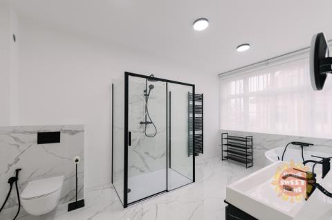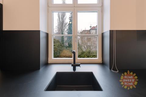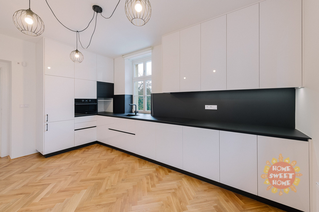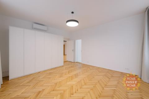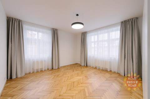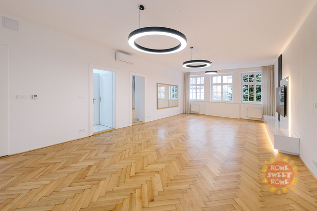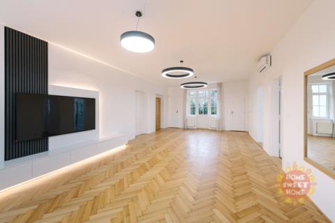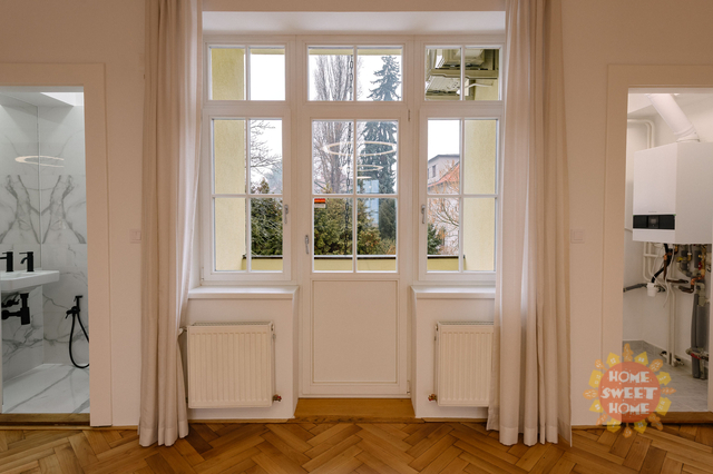 Nabízíme k pronájmu prostorný a světlý byt 3+1 s lodžií po kompletní rekonstrukci v nejvyšším standardu. Součástí nabídky je parkování a možnost užívání zahrady. Byt se nachází v prestižní rezidenční čtvrti Hanspaulka, v ulici Na viničních horách, Praha 6. Byt o celkové ploše 137 m² je situován v 1. patře udržované činžovní vily v bezprostřední blízkosti lesoparku Horní Šárka a nabízí výbornou dopravní dostupnost do centra města. Nejbližší stanice metra jsou Bořislavka a Dejvická. Byt je nabízen částečně zařízený. Dispozičně nabízí prostorný obývací pokoj s jídelní částí a vstupem na lodžii s výhledem do zahrady, plně vybavenou kuchyni, hlavní ložnici s en-suite koupelnou (vana, sprchový kout, toaleta), druhou ložnici, samostatnou toaletu a technickou místnost. Všechny místnosti jsou klimatizované. Interiér se vyznačuje vysokými stropy, velkými okny s posuvnými roletami, dřevěnými parketami a velkoformátovou dlažbou. Po dohodě s majitelem je možné byt dovybavit pračkou a sušičkou. V technické místnosti je umístěn plynový kotel. Dům nemá výtah. Nájemci mají k dispozici pečlivě udržovanou zahradu ve vnitrobloku a parkování přímo na pozemku za dálkově ovládanou branou pro 1–2 automobily (1 parkovací stání je zahrnuto v ceně nájmu). V případě zájmu o prohlídku nás neváhejte kontaktovat.