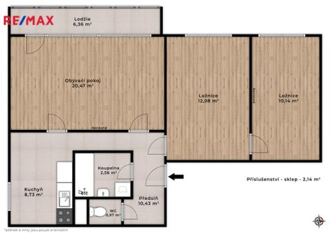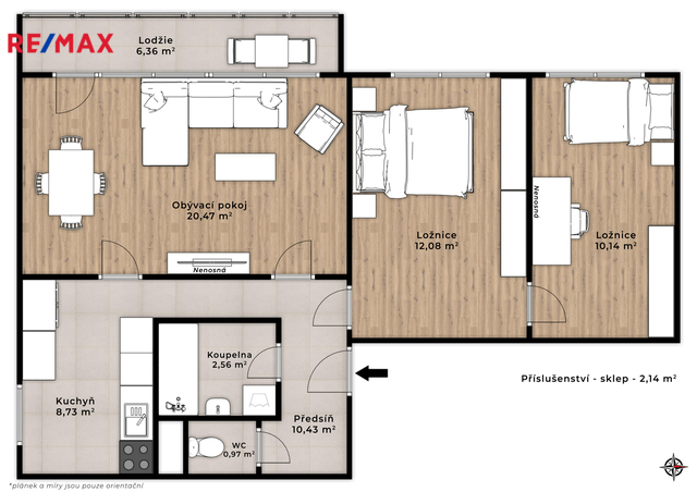 obývací pokoj 20,47 m², kuchyně 8,73 m², ložnice 10,14 m², ložnice 12,08 m², koupelna 2,56 m², WC 0,97 m², chodba 10,43 m², komora 2,14 m² a lodžie 6,36 m². Celková plocha včetně lodžie je 73,88 m².