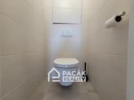 sprchovou skleněnou zástěnou, v koupelně je umístěna automatická pračka, WC je