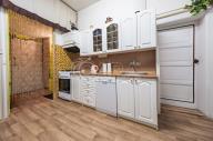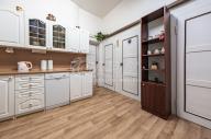 Předsíní se vstupuje přímo do velké kuchyně s jídelnou, kde vše je k dispozici pro nové nájemníky, velká lednice s mrazákem, myčka nádobí, plynový sporák s elektrickou troubou, odsavač par, mikrovlnná trouba, varná konvice, topinkovač, kávovar a jídelní kout se stolem a židlemi. Samostatná spíž nabízí dodatek místa pro uložení potravin a jiných maličkostí.