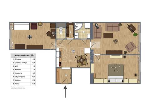 Z obývacího pokoje se vchází do vybavené prostorné ložnice. Z kuchyně je dostupná i koupelna se sprchovým koutem, umyvadlem a pračkou. Toaleta je také samostatná a dostupná opět z kuchyně.