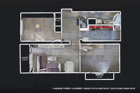 • Obývací pokoj s jídelním koutem (18 m²) a lodžií (3,6 m2)