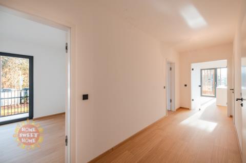 vstupní chodba o rozloze 11m2, prostorný obývací pokoj 37 m2 s kuchyňskou linkou vybavenou veškerými spotřebiči (indukční deska, trouba, myčka a lednice) se vstupem na terasu 11 m2, orientovaný na jih, dvě samostatné ložnice o rozloze 12 m2, orientované na východ se společnou terasou 17 m2, jedna ložnice s vestavěnou skříní, technická místnost 2,5 m2, koupelna s vanou a samostatná toaleta.