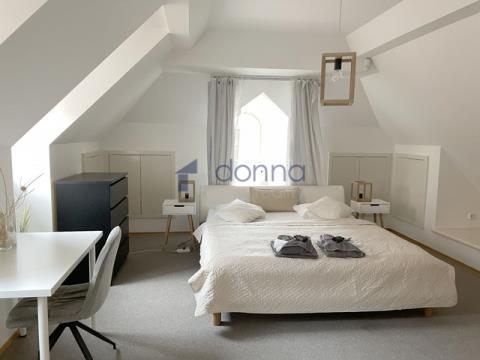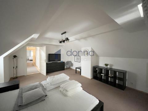 Nabízíme k pronájmu krásný podkrovní byt 3+kk, 126m2, ve 3. patře zrekonstruovaného historického domu bez výtahu, s výhledem na malebné střechy Starého Města, v ulici Řetězová, Praha 1 - Staré Město. Byt je přístupný schodišťovou halou ze 3. patra domu s vestavěnou skříňovou sestavou v předsíni. Prostorný obývací pokoj je propojen s kuchyňským koutem plně vybaveným vestavnými spotřebiči - indukční varnou deskou, elektrickou troubou s teleskopickým výsuvem, lednicí, vestavěným mrazákem AEG a vinotékou. Dvě velké ložnice mají samostatný vstup z chodby, stejně jako koupelna se sprchovým koutem, pračkou, sušičkou a WC, další WC je zvlášť. Byt disponuje velkým množstvím úložných prostor ve formě vestavných skříní využívajících podkrovní prostor v každém pokoji. Ústřední vytápění a ohřev TUV. Dle individuální domluvy lze ponechat byt vybavený. Dům se nachází v tiché ulici v samém srdci historického centra Prahy. Skvělá dopravní dostupnost v blízkosti stanice Staroměstská, metro trasa A, možnost parkování na ulici.