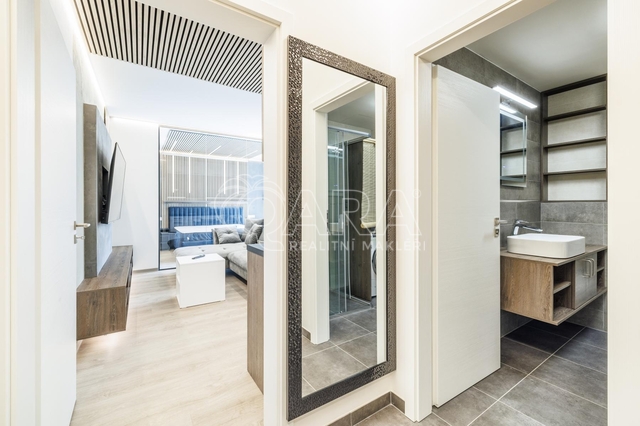 Hledáte absolutní špičku mezi nájmy v Plzni? Nabízíme k pronájmu technologicky vyspělý, kompletně zařízený byt o dispozici 3+kk (60,4 m²) s balkonem a garážovým stáním. Tato novostavba z roku 2023 v ulici Na Jíkalce představuje dokonalou symbiózu moderního designu, chytrých technologií a soukromí, a to jen pár kroků od historického centra města. Interiér, který ovládáte svým telefonem Byt je navržen pro náročné nájemníky, kteří ocení špičkové materiály a automatizaci pro každodenní komfort: Smart Kuchyně & Obývací prostor: Kuchyňská linka je osazena prémiovými spotřebiči značky Miele (myčka, horkovzdušná a mikrovlnná trouba, indukční varná deska a digestoř), které lze ovládat na dálku pomocí aplikace. Součástí obývacího prostoru je designový jídelní stůl s integrovanou vinotékou, pohodlná sedací souprava a TV. Designová ložnice: Dominantou je stylová prosklená příčka, která prostoru dodává vzdušnost. Pro naprosté soukromí lze využít elektrické zatemňovací závěsy. Postel disponuje efektním podsvícením na pohybový senzor. Variabilní druhý pokoj: Pokoj s vlastním pracovním místem u okna a samostatnou šatnou poslouží skvěle jako pracovna, dětský pokoj nebo zázemí pro hosty. Oba pokoje mají přímý vstup na balkon orientovaný do klidného vnitrobloku. Koupelna: Elegantní provedení se sprchovým koutem, bidetovou sprškou a setem pračky se sušičkou. Komfort doplňuje vyhřívané zrcadlo s úpravou proti mlžení. Technologie pro váš komfort a bezpečí Chytrý přístup: Vstupní dveře s elektronickým zámkem (přístup přes kód, otisk prstu nebo aplikaci) – ideální pro dálkové udělení vstupu návštěvě či službám. Tepelná pohoda: Podlahové vytápění v celém bytě a elektrické zatemňovací žaluzie v hlavních místnostech pro dokonalý spánek. Světelný komfort: Noční orientační světla a senzory pohybu v předsíni zajišťují bezpečný pohyb bytem i za tmy. Exkluzivní zázemí rezidence K bytu náleží vlastní kryté garážové stání (zakladač). Rezidenti mají navíc výhradní přístup do privátní zahrady ve vnitrobloku – oázy klidu uprostřed města, kterou využijete pro relaxaci i setkávání. Tento byt není jen místem k přespání, je to životní styl pro ty, kteří chtějí mít technologie pod kontrolou a centrum Plzně na dosah ruky.