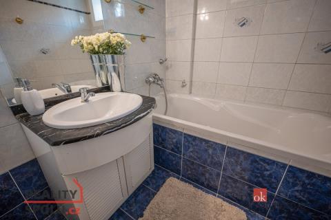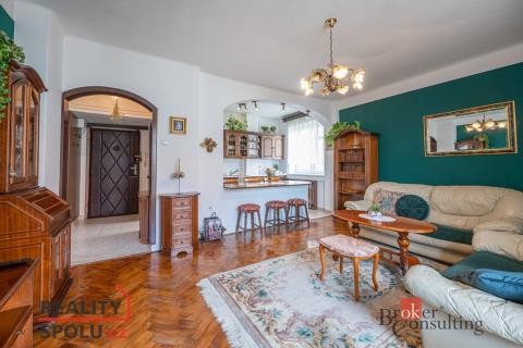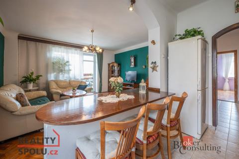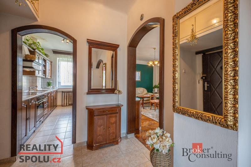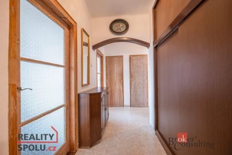 Po vstupu do bytu bezpečnostními dveřmi se dostanete do chodby, kde najdete botník, věšák na míru a vestavěnou skříň. Z chodby se můžete dostat do obývacího pokoje, dětského pokoje, ložnice, samostatné toalety, koupelny a komory, kde je místo pro pračku a úložný prostor. Prostorný obývací pokoj je šikovně propojený s kuchyňským koutem s masivní dřevěnou linkou, jídelním stolem a vstupem na balkón. V ložnici a dětském pokoji najdete plovoucí podlahu a v obývacím pokoji pak dubové parkety.