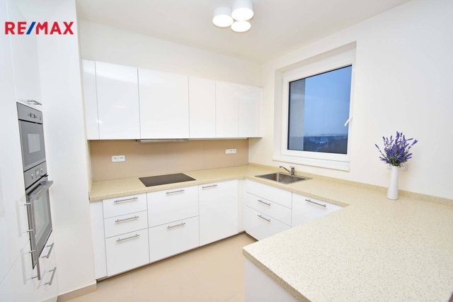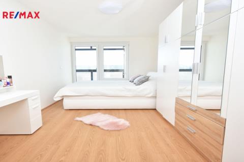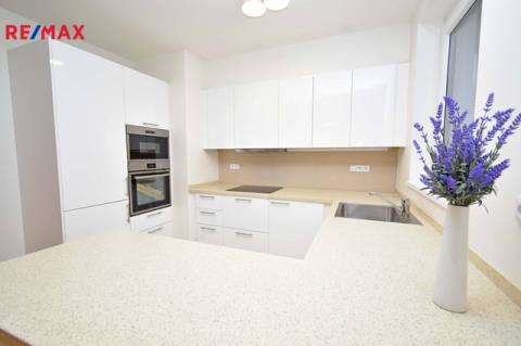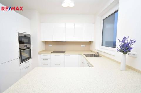 Krásný a výjimečný byt o dispozici 3+kk a výměře 87 m2 Vám nabízí velkou vstupní chodbu, šatnu s přípravou pro pračku, ložnici s vlastní terasou, druhou samostatnou ložnici s terasou (terasa pro ložnici a obývací pokoj), prostornou chodbu, koupelnu s vanou a umyvadlem, samostatnou toaletu, obývací pokoj s terasou, jídelnu a kuchyňský kout včetně zabudovaných spotřebičů (lednice s mrazákem, varná deska, trouba, digestoř a myčka). Součástí pronájmu jsou dvě velké terasy se zasklením, garážové parkovací stání v budově a prostorná komora u parkovacího stání.