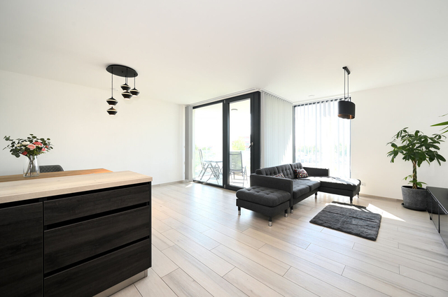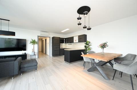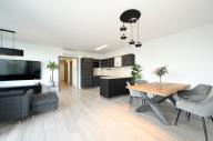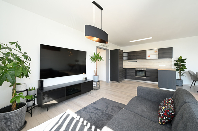 Světlý obývací pokoj je propojen s kuchyňským koutem, který je plně vybaven moderními spotřebiči, jako jsou vestavěná lednice s mrazákem, el. trouba, digestoř, myčka a mikrovlnná trouba. Z obývacího pokoje je přímý přístup na lodžii, která je ideálním místem pro relaxaci.