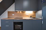 Kuchyně propojená s obývacím koutem, velká okna a krásný výhled nabízí příjemnou atmosféru bydlení.