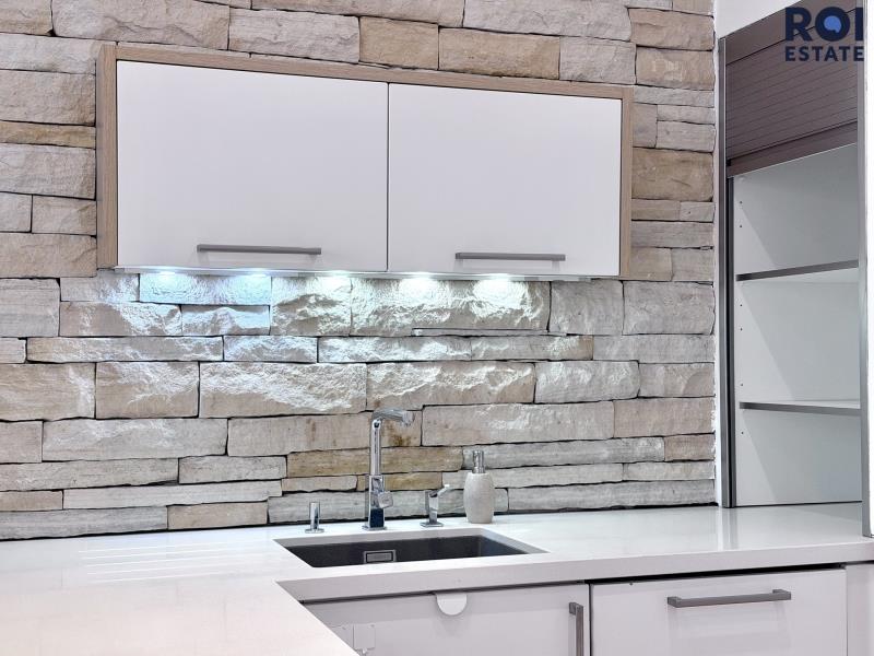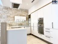 kuchyňská linka s velkým množstvím úložných prostor, vestavěné spotřebiče nejvyšší kvality včetně varné desky, trouby, myčky a lednice, dvě chladničky (klasická a na víno/nápoje), integrovaný kávový koutek s možností skrytí, barový pult s návazností na jídelní prostor
