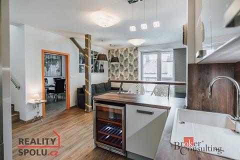 Pronájem krásného mezonetu 4+kk s terasou, balkónem a parkováním, ul. Věžní, Jihlava Nabízíme k pronájmu moderní mezonetový byt 4+kk s užitnou plochou 95 m² situovaný v samotném centru Jihlavy. Byt je kompletně zařízený designovým nábytkem a disponuje balkónem, prostornou terasou a sklepem na patře přímo naproti bytu. K bytu lze rovněž pronajmout kryté parkovací stání za 1500 Kč/měsíčně, což je v centru města velkým benefitem. Spodní podlaží je samostatnými místnostmi rozděleno na obývací a jídelní část. Moderní kuchyňská linka je elegantně začleněna do obývacího prostoru a nabízí kompletní vybavení vestavěnými spotřebiči včetně vlastní vinotéky. V přízemí navazuje na obývací část balkón a další pokoj využívaný jako samostatná jídelní část, která je vybavena designovým jídelním stolem a židlemi podtrhující celkový interiéru bytu. Ve spodním podlaží lze rovněž nalézt první koupelnu se sprchovým koutem a toaletou. V horním patře se nacházejí dva samostatné pokoje, druhá koupelna a prostorná terasa. První pokoj je koncipován jako ložnice vybavená moderní postelí, útulnou lenoškou a designovým lustrem. Další místnost je využívána jako prostorná šatna. Druhá koupelna nabízí vanu, toaletu, pračku se sušičkou, která je efektivně zabudovaná v uzavíratelné skříni a neruší tak celkový vzhled interiéru dané místnosti. Součástí terasy je venkovní posezení včetně grilu. Ulice Věžní nabízí veškerou občanskou vybavenost. V docházkové vzdálenosti lze nalézt poštu, lékárny, banky, školky, obchody, restaurace, kavárny či Kino Dukla. Autobusové nádraží je vzdálené přibližně 10 minut chůze od bytu. V obdobné docházkové vzdálenosti (přibližně 10 minut) se nachází obchodní centrum Citypark. V okolí domu je park Gustava Mahlera. Výše měsíčního nájemného činí 21 000 Kč. Cena pronájmu nezahrnuje zálohy na energie (6000 Kč), elektrická energie se nepřepisuje na nájemce a parkovací stání (2000 Kč). Vratná kauce činí 40.000 Kč. Provize je ve výši jednoho nájmu + DPH. Součástí vybavení bytu bude rovněž televize, která není zobrazena na fotografiích. V případě zájmu o pronájem nás neváhejte kontaktovat.