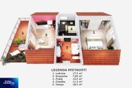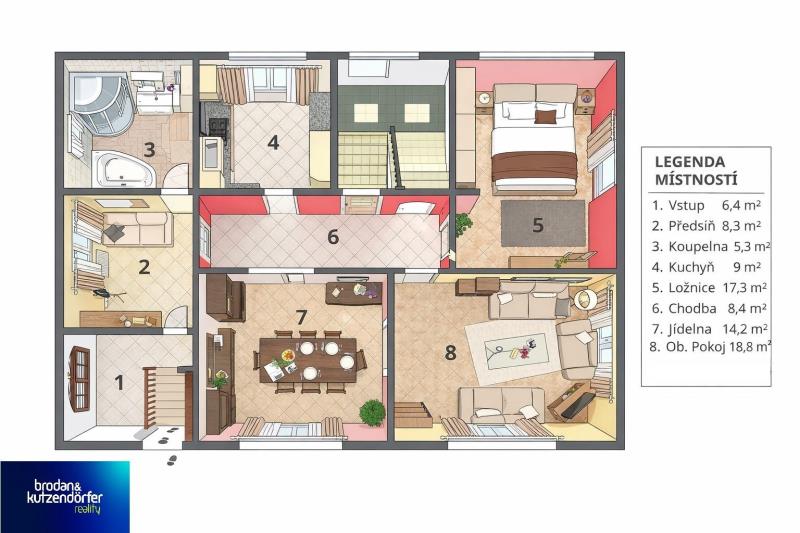 Vstupní chodba, koupelna, samostatná kuchyně, ložnice, prostorný obývací pokoj propojený s jídelnou, schodiště do patra a do suterénu.