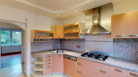 Prostorná garáž, prádelna, kotelna, místnost na skladování dřeva, další úložné prostory a menší sklep přístupný přímo ze zahrady.