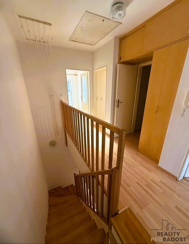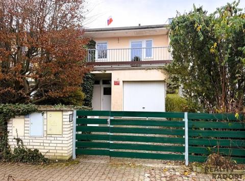 Dům je cihlový a má dvě podlaží s celkovou užitnou plochou 125 m² a plochou parcely 300 m². V přízemí se nachází předsíň, chodba se schodištěm, světlý obývací pokoj s plně vybaveným kuchyňským koutem a jídelnou, samostatné WC, komora a dvě prostorné vestavěné skříně. V patře jsou tři ložnice, každá s přístupem na balkón, dále menší pracovna a koupelna s WC a pračkou. Obytné místnosti jsou orientovány převážně na jih, tedy dům je příjemně světlý a nabízí výhledy do zeleně. Součástí domu je zahrada s terasou, která je vhodná k posezení a relaxaci. Parkování je možné na pozemku nebo před domem. Ulice je velmi tichá, bez rušivého provozu.