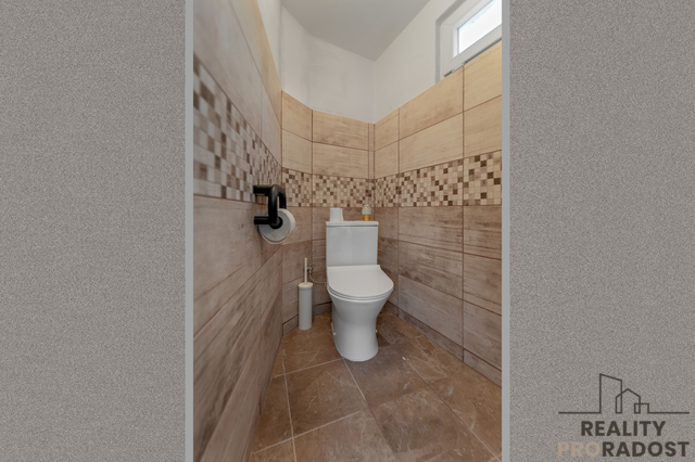 Výhodou tohoto domu je to, že koupelna s toaletou je hned za dveřmi, takže v případě práce venku nebo rodinné oslavy, nemusíte přes celý dům.