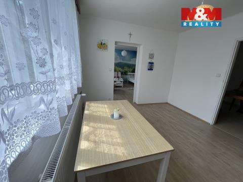 Nabízíme k pronájmu rodinný dům v Návsí. Zděný, dvoupodlažní a podsklepený dům o dvou bytových jednotkách. V 1.NP se nachází bytová jednotka 2+kk s dispozicí: kuchyňský kout, s vybavenou kuchyňskou linkou, troubou, dvěma stoly a židlemi. Obývací pokoj, koupelna a samostatné WC. Dále je k dispozici i místnost - komora na veškeré úklidové prostředky a spotřebiče. Z chodby je vstup do neprůchozí ložnice. K bytu je možnost i půdních prostor a zahrada. Parkování před domem. Vytápění domu je řešeno kotlem na tuhá paliva. V přízemí domu bydlí majitelka a pronajímá se 1.patro. Náklady činí 10.000.-Kč nájem, 1.500.-Kč elektřina, 2.500.-Kč topení a 500.- Kč voda/osoba. Provize RK činí 1měs.nájem+DPH. Dům se nachází v klidné lokalitě, v blízkosti veškerého občanského vybavení. Dům je volný ihned. Před nastěhování zaplatí zájemce vratnou kauci, která je 3x měsíční nájem. Přednosti této nemovitosti: velmi dobrý stav bez dalších investic - dům je vybaven - odpovídá vyobrazenému na fotografiích.