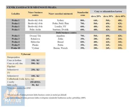Nabízíme kancelářské prostory 12 m2 pro 2 osoby s výhledem do átria za 18.500 Kč + DPH měsíčně. Kancelář je plně vybavená, klimatizovaná a zahrnuje přístup 24/7. Cena obsahuje také využití sdílených prostor jako jsou kuchyňky, recepce, relax zóny a neomezenou konzumaci občerstvení. Internetové připojení, úklid, údržba a ostraha budovy jsou také zahrnuty. Využívání zasedací místnosti je možné dle aktuálně platného ceníku - při častějším využívání místností doporučujeme program Zákaznické karty*. Při podpisu smlouvy na 12 měsíců vratná kauce ve výši 2 měsíčních nájmů. K ceně se připočítává poplatek za osobu 1.000 Kč + DPH/měsíc/osoba. Parkovací místo za 5.500 Kč + DPH/měsíc. Věrnostní program: Zákaznická karta Využijte Zákaznické karty a získejte slevy na pronájem zasedacích místností na všech pobočkách v Praze. Platnost karty je jeden rok od posledního dobití. •Cena karty 12.000 Kč - sleva 40% z jednorázové ceny pronájmu •Cena karty 9.000 Kč - sleva 30% z jednorázové ceny pronájmu •Cena karty 6.000 Kč - sleva 20% z jednorázové ceny pronájmu Uvedené ceny jsou bez DPH. Kredit na kartě je nevratný, doporučuje se proto vyčerpat během jednoho roku. Hodnota PENB G* údaj nebyl dodán, hodnota bude aktualizována.