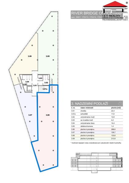 Dovolujeme si Vám nabídnout nové moderní kanceláře na Praze 5 – Hlubočepy, v blízkosti Dvoreckého mostu, který v dohledné době propojí oba břehy řeky Vltavy. Prostory o celkové výměře 288,6 m2 se nachází ve 3.patře administrativní budovy na břehu řeky Vltavy, která se stane součástí areálu River Business Centre. Kanceláře disponují vlastní kuchyňkou, ale je možné k nim využívat sociální zázemí o velikosti 55,1 m2, které se nachází na patře. Služby spojené s užíváním prostorů jsou stanovené na cenu 140 Kč za m2 plochy pronájmu. Areál disponuje recepcí, včetně obsluhy, ostrahou objektu 24/7, výtahem a skvělou dopravní dostupností – navazuje na Strakonickou a pouze pár metrů od kanceláří se nachází zastávka MHD Lihovar. Kanceláře jsou přesto velmi tiché a klidné. Areál nabízí také parkovací místa – jedná se o krytá i venkovní parkovací stání v areálu a okolí. První měsíce jsou za zvýhodněné nájemné, tedy pouze za 6,99 EUR/m2/měsíc. Volné od 1.3.2026 k nastěhování. Provizi RK neplatíte.