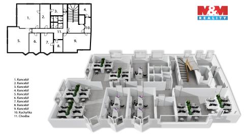 Nabízíme k pronájmu reprezentativní kancelářské prostory o výměře 331 m² v centru Pardubic. Prostory se nacházejí ve 3. nadzemním podlaží cihlové budovy s výtahem. Dispozice zahrnuje 9 místností s možností variabilního uspořádání dle potřeb nájemníka. Všechny místnosti jsou klimatizovány, k dispozici je vlastní kuchyňka a sociální zařízení. Moderní technické zázemí je ideální pro IT provoz, call centra a kancelářskou činnost. Objekt je bezbariérový, s 1 vyhrazeným parkovacím stáním ve vnitrobloku. Výborná dopravní dostupnost, restaurace a banka přímo v objektu, další parkoviště a MHD v pěší dostupnosti. Prostory jsou k dispozici od 1. 4. 2026. Veškeré další informace u makléře.