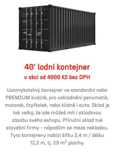 Popis : NÁJEM 1 až 3x lodního kontejneru 20´, vjezdový, uzamykatelný s manipulační plochou. Výborný stav. Volné IHNED. Velikost: 14 m2 Cena: 3 000,-Kč/kontejner/měsíc + DPH Pronajmeme prostory na skladování, o výměře 14 m2 ( Kontejner 20´), manipulační plocha. Po dohodě možno kontejnery 40´ cca 29 m2 ( 6.000,-Kč). Vše přístupné 24 hod., kamerový systém. Příjezd veškerou nákladní dopravou. Nájem možný IHNED. ČERNÝ Pavel ---------------- 2025 ----------------------- ARCHA - průmyslová kancelář ( Praha, Beroun ) -Prodej a pronájem skladů/dílen/kanceláří -Prodej pozemků pro průmysl -Výstavba skladů/dílen/areálů pro logistiku